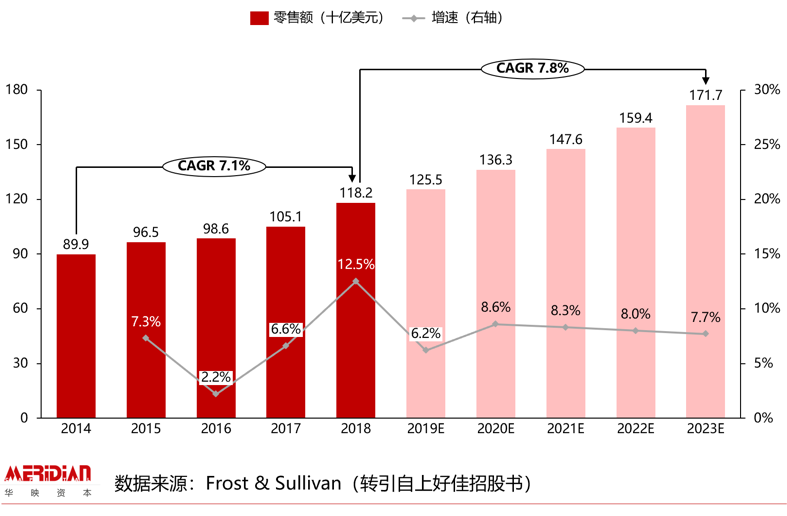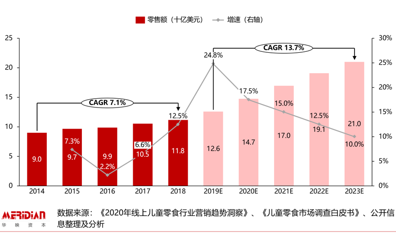 从市场规模来看,儿童零食市场规模约为休闲零食市场规模的1/10。根据沙利文预测,休闲零食2023年有望突破1700亿美元,约合1.2万亿元。据华映资本估算,儿童零食2023年有望达到210亿美元,约合近1500亿元。但从增速角度来看,儿童零食预计未来5年CAGR保持在13.7%,高于休闲零食未来5年的CAGR7.8%。