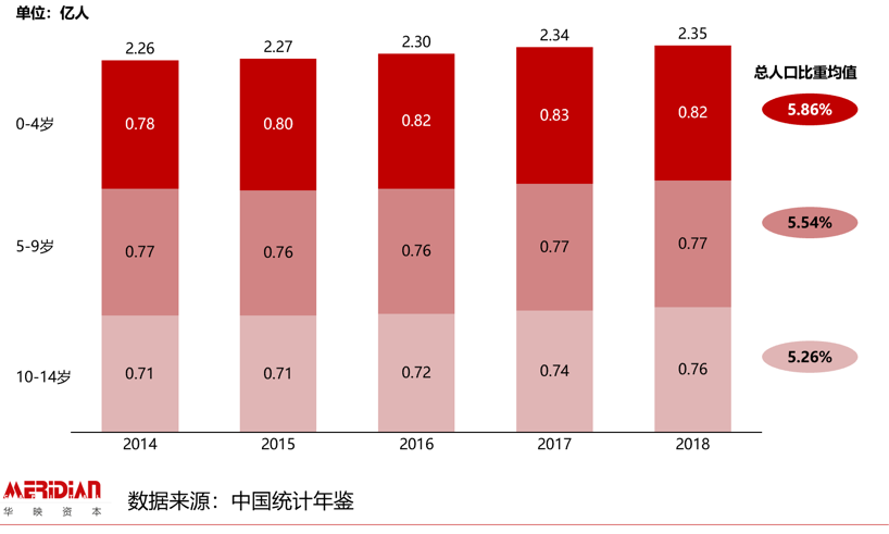 据2015-2019年中国统计年鉴,0-14岁儿童占总人口比重稳定于17%左右;2018年0-14岁儿童人口近2.35亿人,其中0-4岁和10-14岁的人口呈增长趋势,5-9岁的人口趋于稳定。具体到儿童零食覆盖人群领域,根据教育部网站数据整理,2018年适龄学前教育及小学生(3-12岁)数量约为1.59亿,约占总人口比重12%。