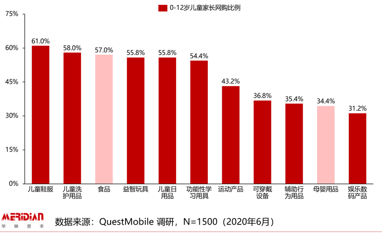 根据QuestMobile调研,儿童家长网购食品的比例为57%,简单估算儿童零食的网购占比约为34%-50%。此外,根据阿里官方数据,2019年儿童零食的线上成交额增速是休闲零食大盘的4倍,是同成交额体量的品类集合的3倍多,亦可得到进一步验证。