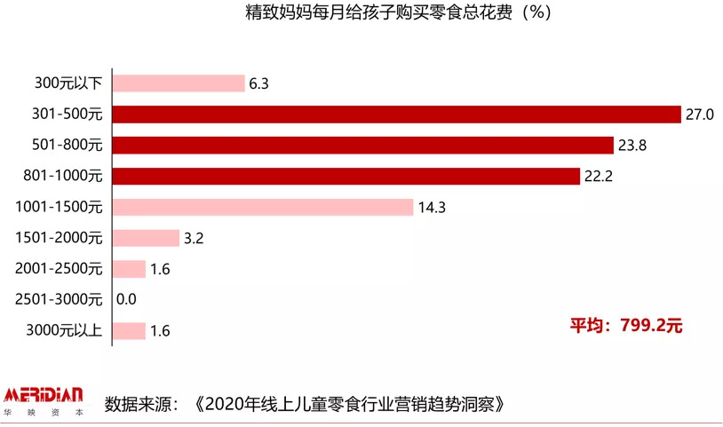 而在儿童零食支出方面,精致妈妈每月给孩子购买零食总花费平均800元,即全年约9600元。