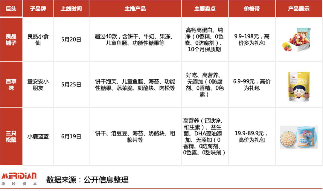 从三只松鼠设立儿童食品公司,到良品铺子联合发布《儿童零食通用要求》团体标准,再到百草味儿童食品子品牌的上线,三大休闲食品巨头均开始在儿童零食端发力。