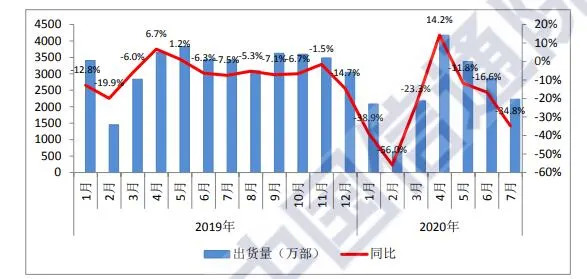 8月中旬,中国信通院发布最新报告,2020年7月中国手机市场出货量为2230.1万部,同比下降34.8%。1-7月整体来看,中国手机市场累计出货量达到1.75亿部,同比下降20.4%。