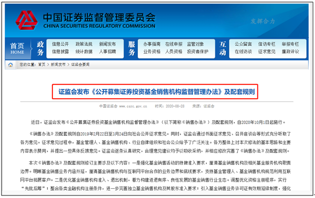 近日,证监会发布《公开募集证券投资基金销售机构监督管理办法》(以下简称《销售办法》)及配套规则,自2020年10月1日起施行。