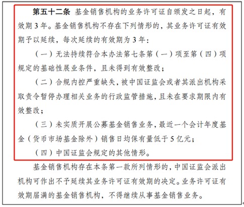 三是优化牌照续展制度。对《销售办法》修订发布后新注册机构执行续展安排,并将不予续展主要限定在三类情形,包括不能满足基础展业条件、合规内控严重缺失、未实质开展公募基金销售业务。