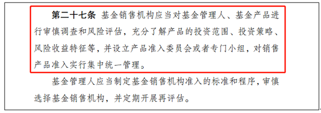 【基金君点评】明确要求销售机构设立产品准入委员会或者专门小组,对销售产品准入实行集中统一管理。