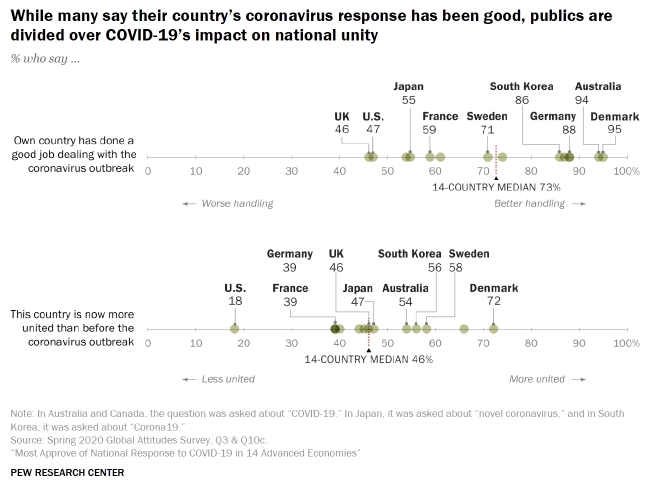 美国民调机构皮尤研究中心(Pew Research Center)官网消息,该中心27日公布的一项调查结果显示,在受访的14个发达国家中,有73%的受访者表示自己的国家在应对新冠疫情方面做得很好。只有27%的人认为他们的国家在应对问题上做得不好。