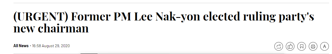韩联社8月29日消息,韩国前总理李洛渊(LEE NAK-YON)当选执政党新主席。