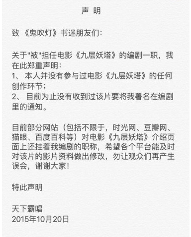 据媒体报道,《鬼吹灯》系列小说作者天下霸唱,以“侵犯作者署名权及保护作品完整权”为由,状告《九层妖塔》侵权。此事目前已经通过天下霸唱代理律师得到证实,被告方为影片出品方中影股份及陆川,索赔金额为100万元。目前,此案的诉讼文件已经提交北京西城区人民法院,但尚未正式立案。