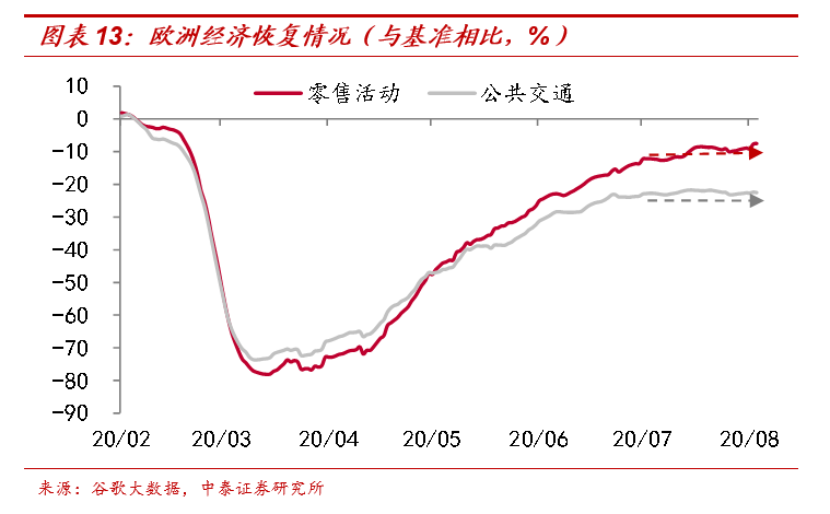 从高频数据来看,欧洲经济恢复也进入了瓶颈期。根据谷歌大数据统计,欧元区零售活动恢复度在6月初仅为60%左右,到8月初恢复至88%,而近两周基本维持在90%左右,欧元区公共交通恢复度近两周也停留在78%左右。