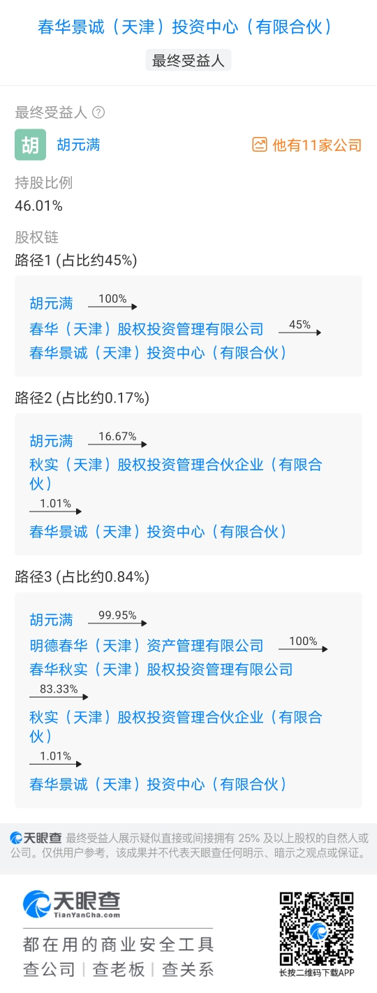 据天眼查app,蚂蚁集团股东春华景信(天津)投资中心穿透后,最终受益人胡元满任持股比例为46.01%。