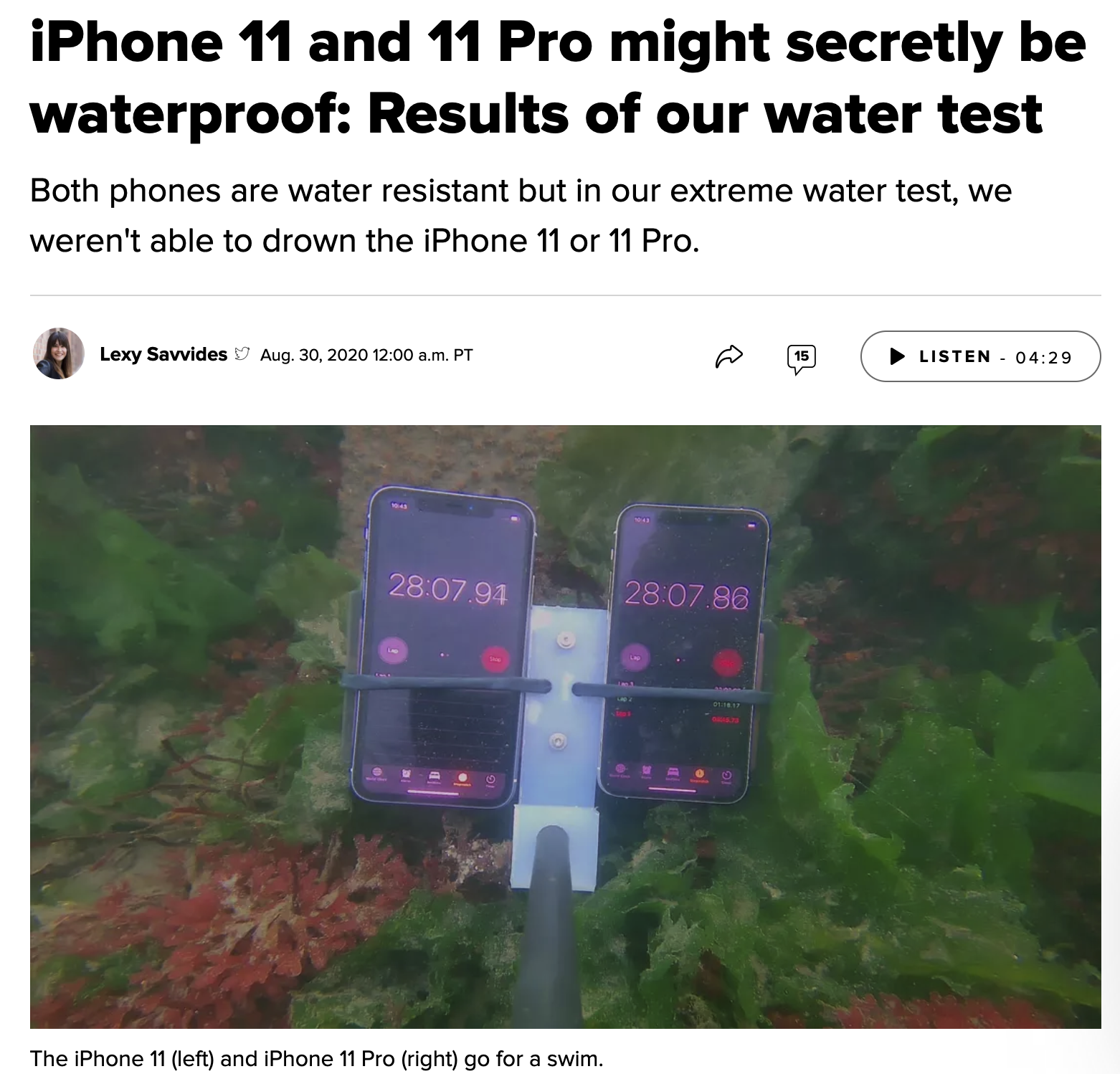 31日消息,据CNET报道,在2019年年底将iPhone 11和iPhone 11 Pro两款手机浸在水中,经过8个月的浸泡、72小时的干燥之后,这两款iPhone仍然能够正常运行。