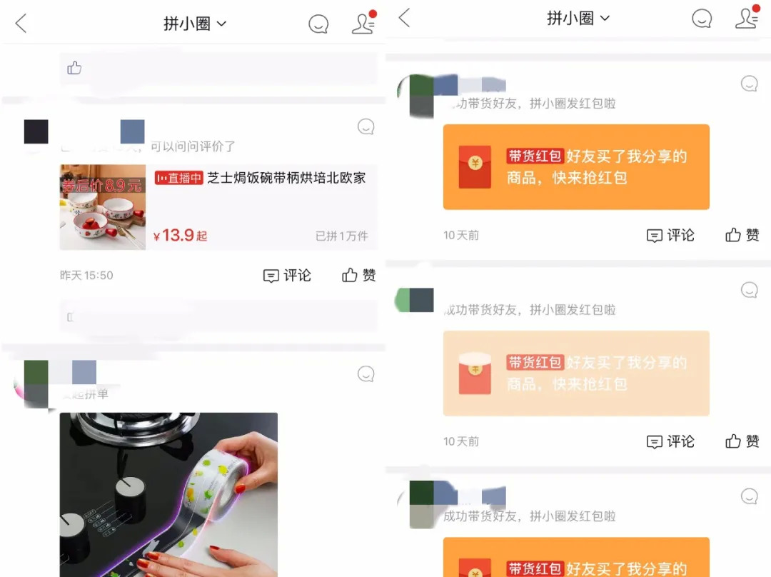 这个圈子里,用户可以做的事情远不止分享好物,还可以向其他用户发起提问,可以在拼小圈中发起新的拼单,甚至可以在好友购买了自己分享的商品后,领取“带货红包”......