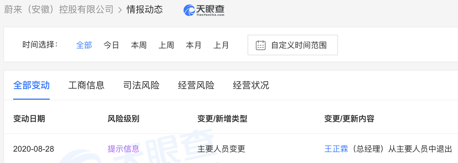 据天眼查APP显示,蔚来(安徽)控股有限公司发生主要人员变更,王正霖卸任公司总经理。