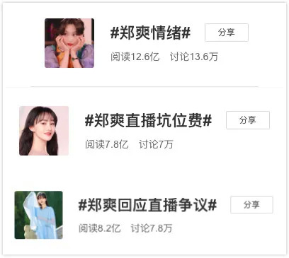 其中,争议最大的是郑爽在快手首场电商直播秀中情绪崩溃,表示整场直播都围绕商品会让她有疲惫的感觉,不太喜欢,并直言这是她的直播间,要以她的方式进行,最终这一次“直播事故”后续在全平台发酵,衍生了17个热搜,以及数以亿计的话题阅读量,其中,#郑爽情绪#12.6亿,#郑爽直播坑位费#7.8亿,#郑爽回应直播争议#8.2亿,网友们围绕郑爽的行为展开了多番讨论。