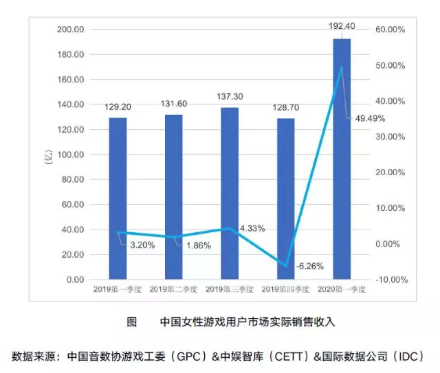 中国音数协游戏工委(GPC)与国际数据公司IDC共同发布的《2020年度第一季度中国游戏产业报告》中,2020年第一季度中国女性游戏用户规模环比增长17.05%,由去年同期的2.90亿人增长为3.57亿人,女性用户对中国游戏收入的贡献快速增长至192.4亿元,环比增长49.49%,增速又创新高。