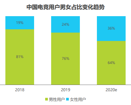 据艾瑞咨询发布的报告显示:2019年电竞用户规模为4.7亿人,预计在2020年将达到5.2亿人,2021年则达到5.5亿人;2019年电竞群体中女性用户占比24%,预计2020年这一比例将达到36%。女性电竞玩家异军突起,未来将有更多的女性用户出现在电竞赛场。随着资本进入,电竞赛事越来越受关注,但市场逐渐扩大的女子职业赛事却发展缓慢。