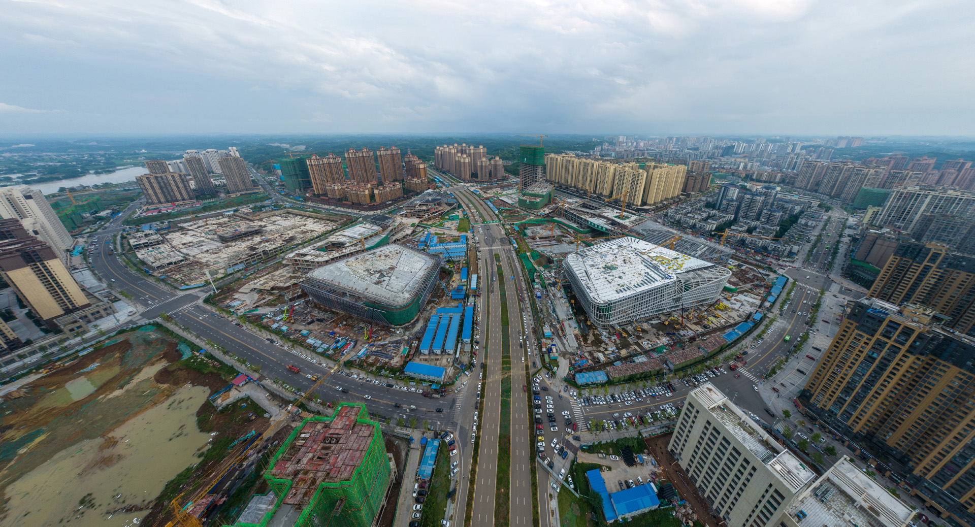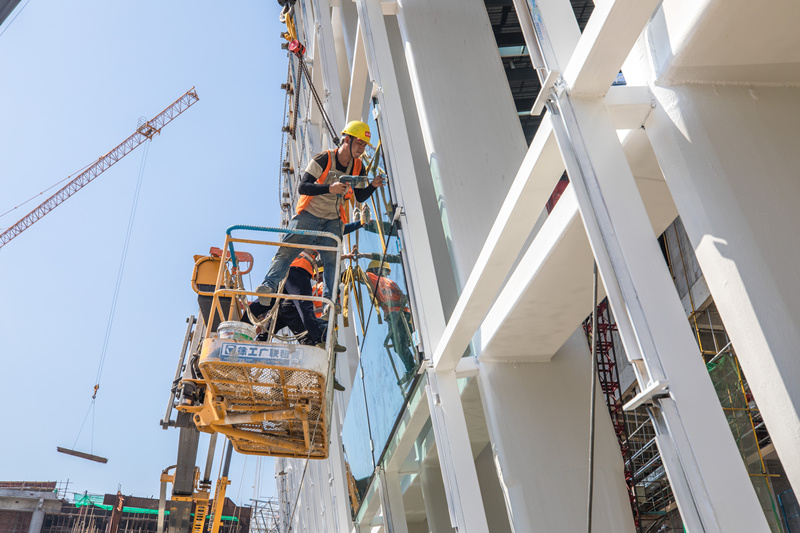 阳光下的简阳东来印象项目施工现场,4号楼、5号楼现场,1200余名工人正在各自工位上紧张地忙碌着,有的在进行室内顶棚施工,有的在对通风管道加装保温棉,有的在对场馆四周的吸音墙龙骨进行最后的焊接,还有的工人顶着烈日、踩着登高车进行玻璃幕墙的安装……现场各种施工的声音此起彼伏,伴随着东来印象体育区生产经理熊伟对讲机里各部门协调的声音,第31届世界大学生夏季运动会柔道赛场、跳水赛事承办地——东来印象项目正一天一个样变化着。