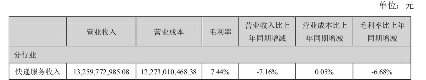 韵达的营收主要分为快递服务收入、物料销售收入和其他业务收入等三部分。就其中营收占比高达92.61%的核心快递服务收入而言,上半年营业收入132.60亿元,同比下降7.16%;在营业成本同比微增0.05%的情况下,快递业务的毛利率为7.44%,同比减少6.68%。