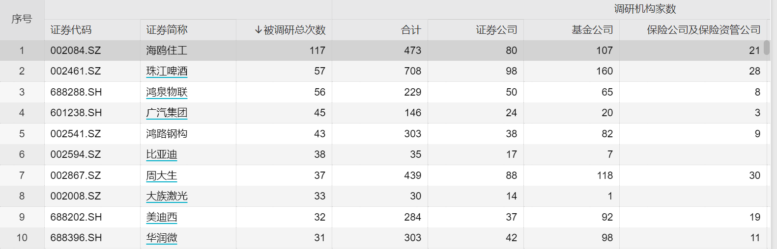 Wind数据显示,今年以来,被调研次数最多的企业是海鸥住工(002084.SZ)。该公司共接受了473家机构的117次调研,其中私募多达215家,公募基金达107家。