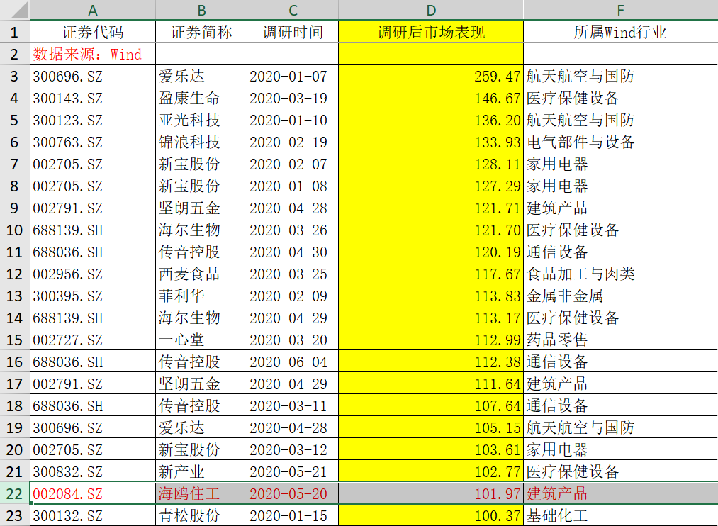 接受调研后股价一定会上涨吗?答案不是绝对的。Wind数据显示,自今年5月20日被调研以来,海鸥住工股价增长了101.97%。