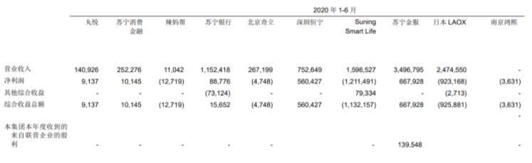 半年报同时披露苏宁在金融领域参控股公司苏宁消费金融、苏宁银行、苏宁金服的相关财务数据。2020年1-6月,苏宁消费金融营业收入2.52亿元,净利润1014.5万元;苏宁银行营业收入11.52亿元,净利润8877.6万元;苏宁金服营业收入34.97亿元,净利润6.68亿元。