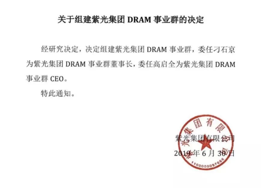 对西安华芯的收购,紫光集团获得了奇梦达遗留的部分DRAM技术,2019年6月30日,紫光集团发展公告,决定组建紫光集团DRAM事业群,委任刁石京为紫光集团DRAM事业群董事长,委任高启全为紫光集团DRAM事业群CEO。