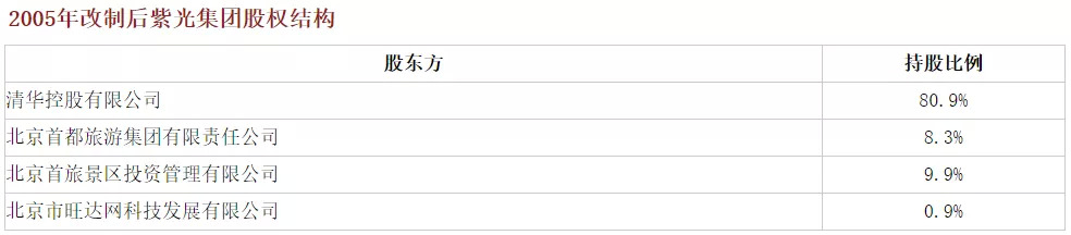 2005年,紫光股份迎来了又一次的重组,经国资产权[2005]411号文和证监公司字[2005]65号的批准,紫光集团将持有的42%紫光股份的股份无偿转让给清华控股,并于2006年3月3日,完成过户登记手续。清华控股成为紫光股份的第一大股东;紫光集团持有紫光股份20.11%,为第二大股东,紫光集团是清华控股的独资国有企业,加上清华控股原本持有的18.79%的股份,清华控股合计持有紫光股份80.9%的股份。在引入的外部投资人中,首旅集团占18.2%,北京市旺达网科技发展有限公司(旺达网)占0.9%。