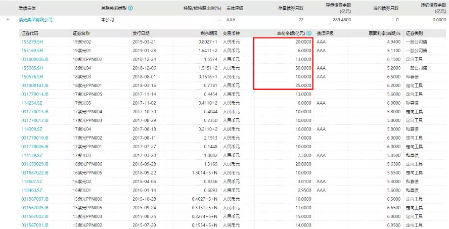2018至2019年间紫光集团大幅举债,债券融资总额逾百亿元。通过Wind查询到,目前紫光集团存量债券有22只,累计余额仍达到289.46亿元,其中一年内到期规模约74亿元。