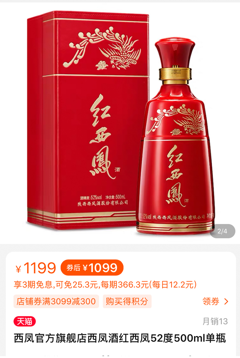针对此次涨价产品,界面记者登录天猫西凤酒官方旗舰店发现,截至发稿前,52度500ml红西凤酒售价1199元/瓶,折后价格1099元/瓶。