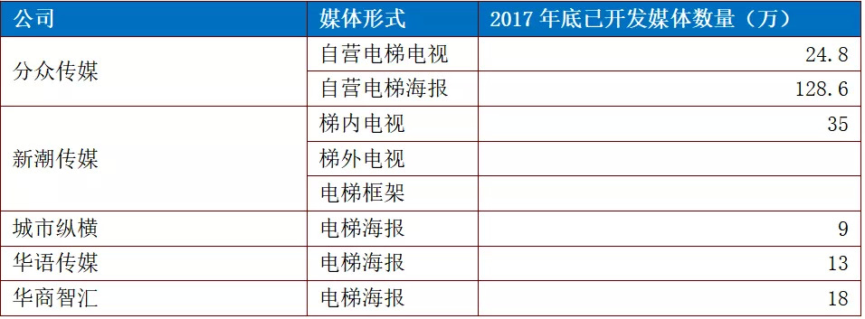 到17年底,分众的自营电梯点位总数达到145万个,是其他4家竞争对手(新潮传媒、城市纵横、华语传媒、华商智汇)点位数总和的2倍以上。
