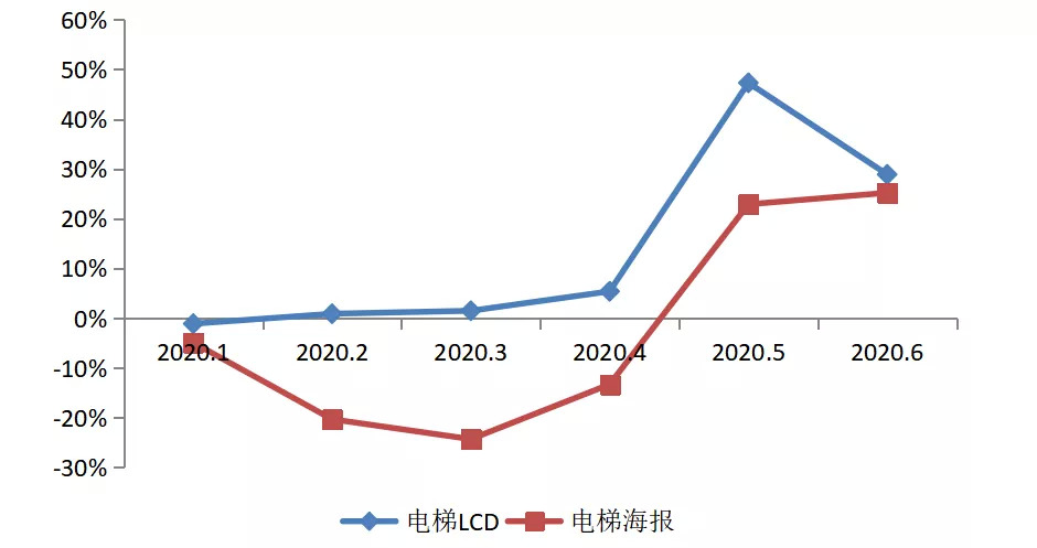 图表:电梯广告刊例花费月度同比变化;来源:CTR