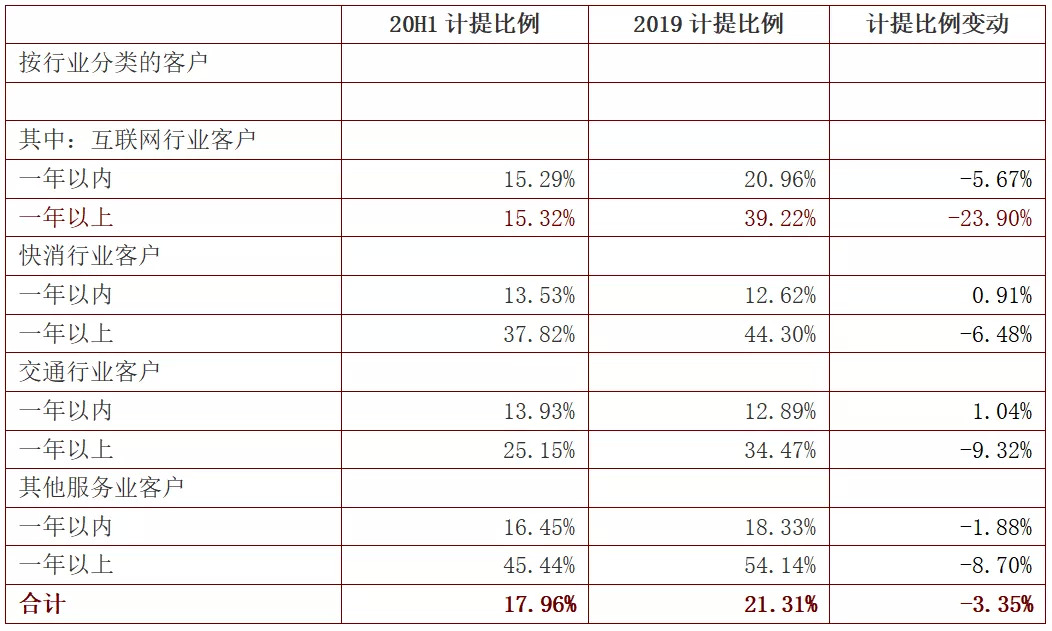 如果将20年中报和19年年报对比,可以发现公司“按行业分类的客户”的坏账计提比例有明显下降。综合计提比例为17.96%,较19年报下降3.35个百分点;其中一年以上互联网行业客户计提比例下降23.9个百分点,下降幅度最大。