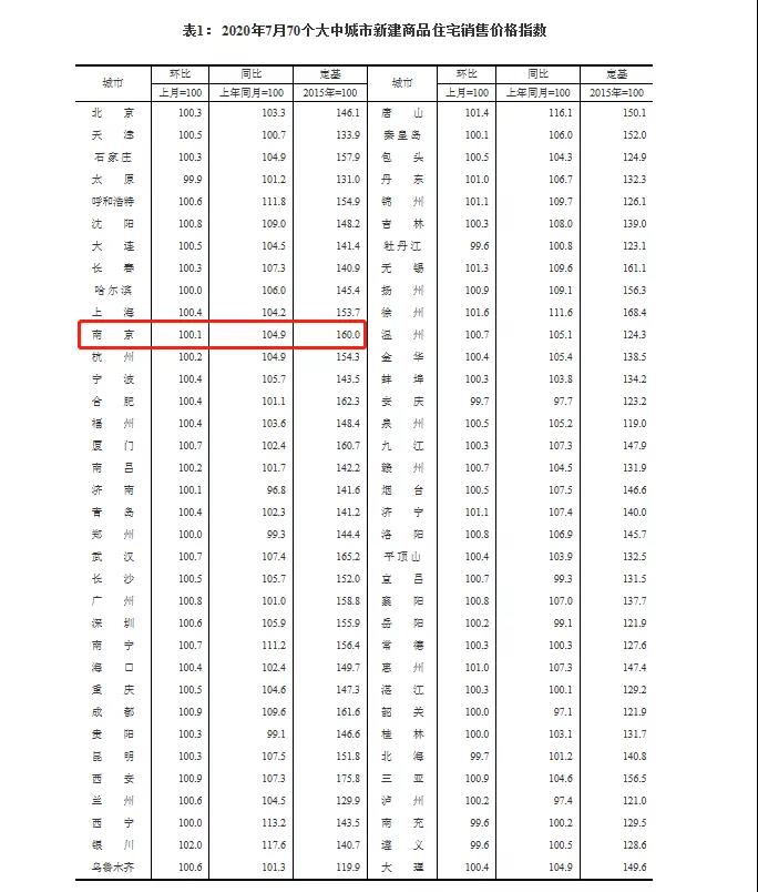 根据8月14日,国家统计局发布的2020年7月份70个大中城市商品住宅销售价格变动情况统计数据显示,7月南京新房价格环比上涨0.1%、同比上涨4.9%。南京房价又涨了!今年3月,南京房价微涨;4月南京房价涨幅排名全国第一;5月房价涨幅排名全国第四;6月南京新房价格更是环比增长1%,涨势惊人!本次7月新房价格实现环比5连涨!
