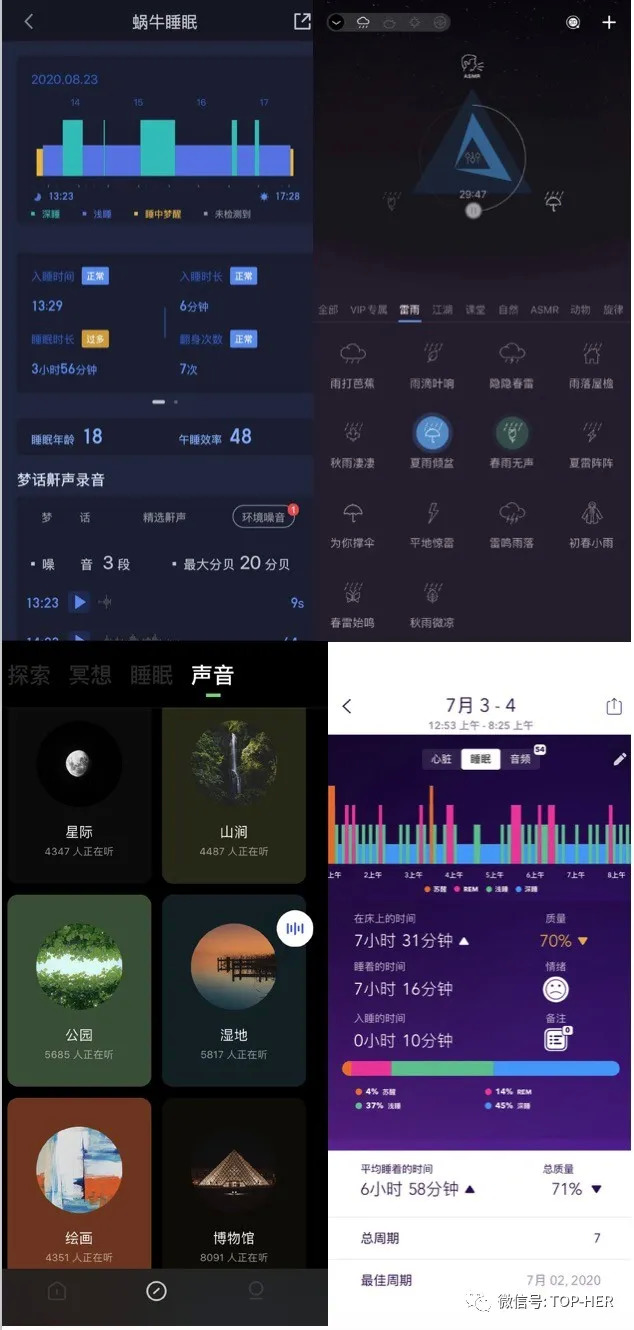 国内头部睡眠APP是蜗牛睡眠、潮汐、小睡眠和Pillow自动睡眠追踪。这些产品不仅可播放海浪、山涧、森林、雨声等催眠音效,也能监测睡眠深度和质量,并提供付费冥想课程等,通过增值、定制和会员服务盈利,主要面向白领用户。