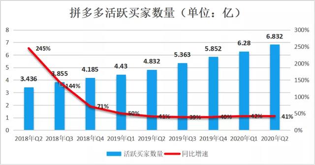 截至2020年6月30日,拼多多平台年活跃买家数达6.832亿,较去年同期的4.832亿增长41%,单季新增5510万活跃买家。