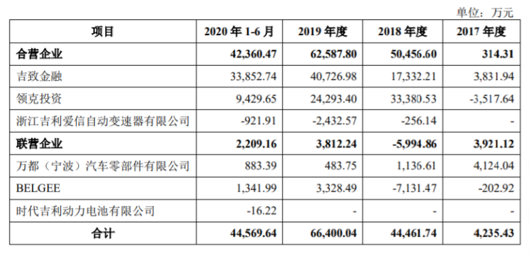 据招股书,吉利汽车权益法核算的长期股权投资中贡献收益较大的被投资单位主要为吉致金融、 领克投资和万都(宁波)汽车零部件有限公司。2020年上半年,吉利汽车投资吉致金融收益为3.39亿元。2017年至2019年投资收益分别为3831.94万元、1.73亿元、4.07亿元。