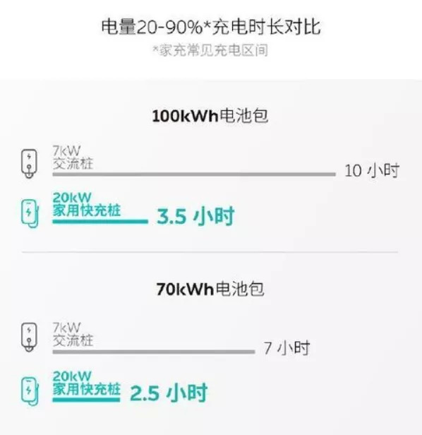 同样以一辆拥有70kWh电池包的纯电动车为例,用车一整天下来,电量剩余20%,用7kW充电桩需要7小时才能冲满电池,改用20kWh充电桩,充电时间仅需2.5小时。