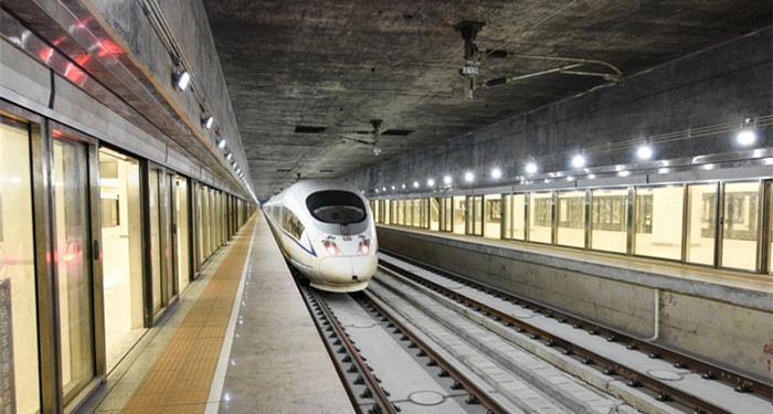试车的和谐号驶离地下车站,福田地下火车站设有8条轨道。