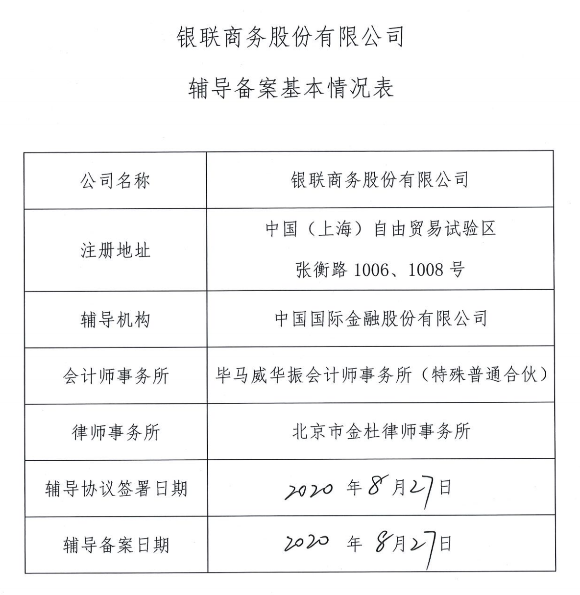 9月1日,中国证监会上海证监局公布关于银联商务股份有限公司首次公开发行人民币普通股(A股)股票并在科创板上市辅导备案情况报告及辅导备案基本情况表,辅导机构为中金公司。