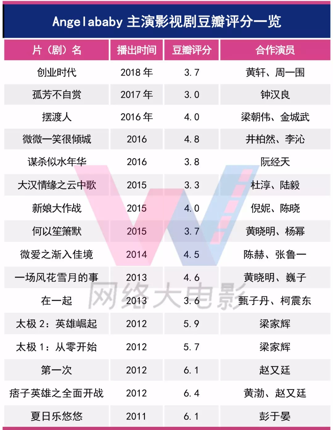 网视互联(ID:wxs360)统计了Angelababy主演影视剧的豆瓣评分情况发现,最高分是2012年跟黄渤、赵又廷主演的《痞子英雄之全面开战》,6.4分,最低分是2017年跟钟汉良主演的《孤芳不自赏》,只有3.0分。