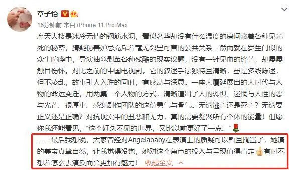9月1日,章子怡在社交媒体上发布追剧感想,却罕见地表扬了Angelababy的演技,“大家曾经对Angelababy在表演上的质疑可以暂且搁置了,她演的美宝真挚自然,让我觉得没饱,她对这个角色的投入与呈现值得肯定。”