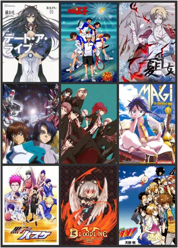 《家庭教师》《俺妹》《火影忍者》《暗杀教室》《阳炎计划》《命运石之门》《我的朋友很少》《青之驱魔师》《魔笛MAGI》《黑子的篮球》《bloodline》《机动战士高达》《夏目友人帐》 《网球王子》《约会大作战》等等。