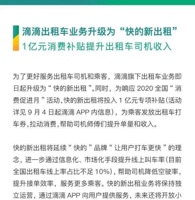 滴滴称,“快的新出租将过信息化、市场化手段提升线上叫车率,帮助司机降低空驶率,提升接单效率,服务更多乘客。 快的新出租业务将保持独立运营,通过滴滴APP向用户提供服务,未来还将开放小程序等入口。”