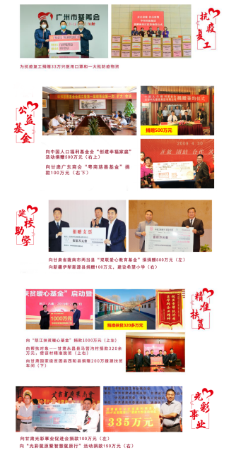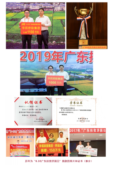 义利合一,回报社会。在20年的发展中,华邦控股集团始终将社会责任提高到自身发展的战略高度,通过精准扶贫、建校助学、公益基金、抗震救灾等方式践行社会责任,共享发展成果。2019-2020年,华邦慈善基金会在广东6·30扶贫济困日累计捐款2100万元,华邦控股集团荣获广东扶贫济困最高荣誉——“2019年度广东扶贫济困红棉杯金杯”;为云南“怒江扶贫暖心基金”捐款1000万元........面对疫情,华邦更是响应党和国家的号召,坚持疫情防控和复工复产两手抓,在做好自身防控的同时,先后捐赠逾33万只医用口罩和一大批防疫物资,驰援抗疫一线;华邦按照党和政府的决策部署,积极推动复工复产,华邦-凯旋在广州市海珠区率先复工,做到“五个到位”,为防疫和建设“双全”发挥示范带头作用,并受邀出席广州市政府新闻发布会,分享华邦抗疫复工的先行经验,助力夺取抗击疫情和经济社会发展双胜利。