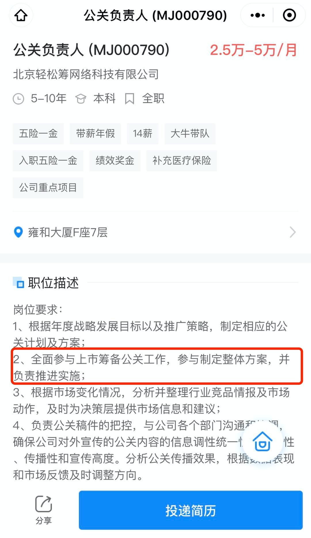 9月2日上午,轻松筹发布一则招聘信息:拟以2.5万元到5万元的月薪寻求一名公关总监,其中一条岗位要求引发业界关注,该要求明确表示:全面参与上市筹备公关工作,参与制定整体方案,并负责推进实施。