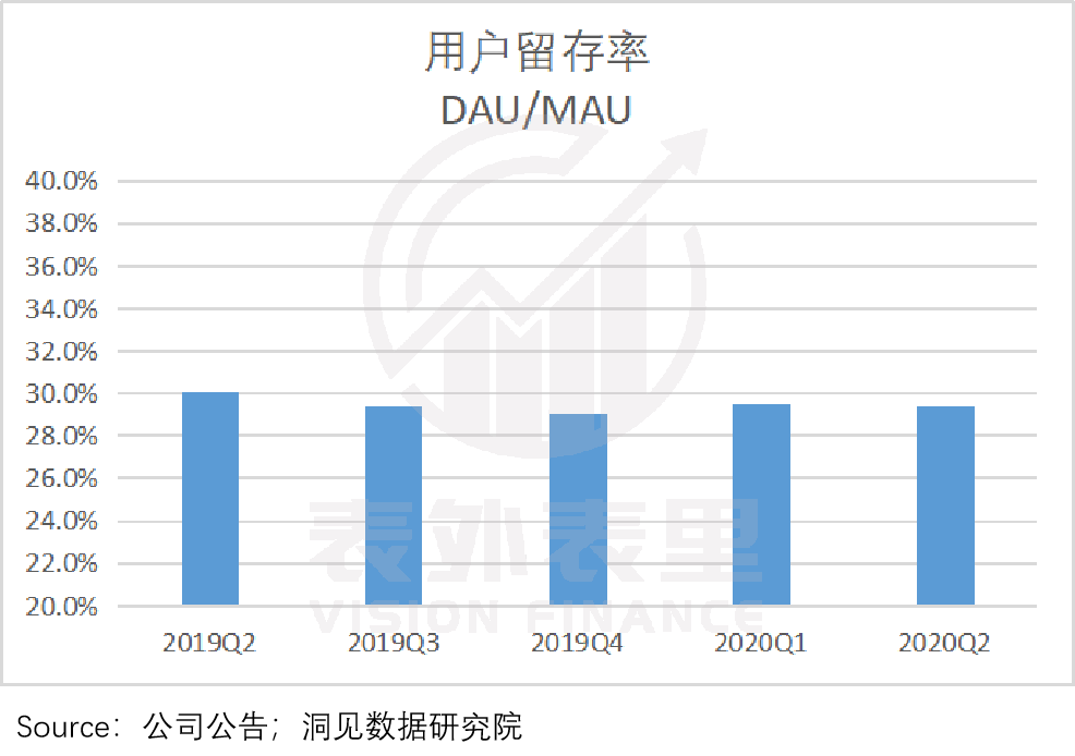同时,用户留存也没有实质性的突破。如下图所示,从2019Q3开始,B站的用户留存率便一直低于30%。
