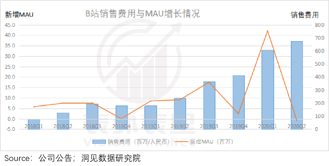如此看来,B站在各个用户群体的认知度是提高了,但是这些砸下去的钱——二季度B站花掉了6.75亿元营销费用,已占到2019年总营销费用的一半——在用户增长方面却仿佛赚得更多的是吆喝。