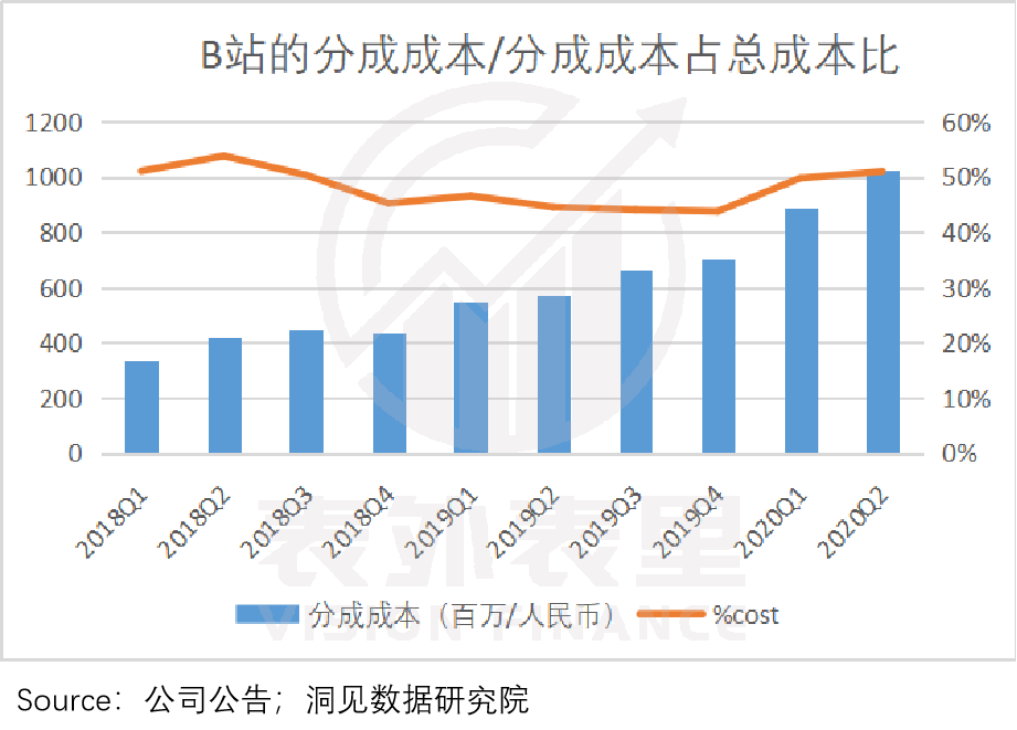 从成本端来看,B站有一笔成本叫分成成本,就是B站需要从收入中分给利益相关方的部分,这部分成本占总成本的一半左右。2020Q2,B站的分成成本达到10.27亿元,较去年同比增长79%,再创新高。