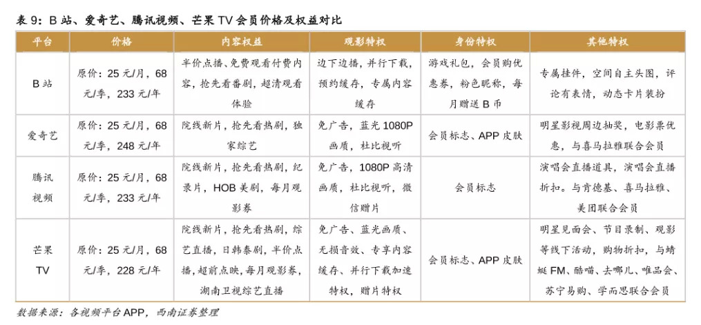 对比下图可以看到,四家视频网站的会员定价标准基本一致。不同之处是,B站的自制节目以及获得长视频版权的实力明显不如其他三家。