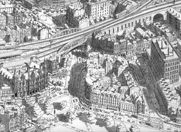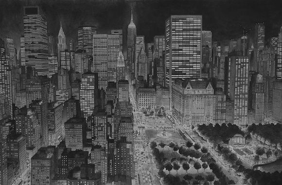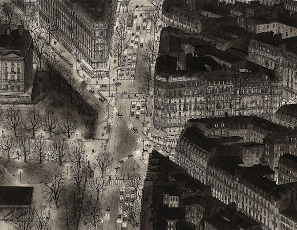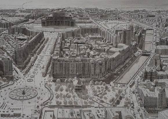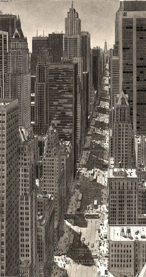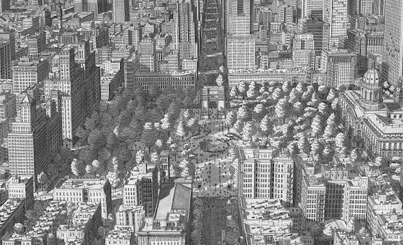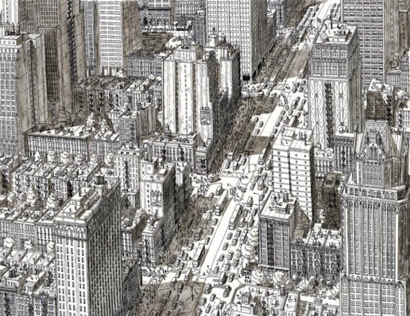 听起来像是个不折不扣的怪咖——那种被现实无聊死,所以选择了埋首另一个世界的堂吉诃德式的人物:这个世界里只有黑白灰的线条,建筑密密匝匝,汽车和人渺小得像爬虫。但是你仔细看去,就会发现连路灯、地铁出入口、店面、公园的长椅,甚至建筑里的窗帘都一一细心描画。
